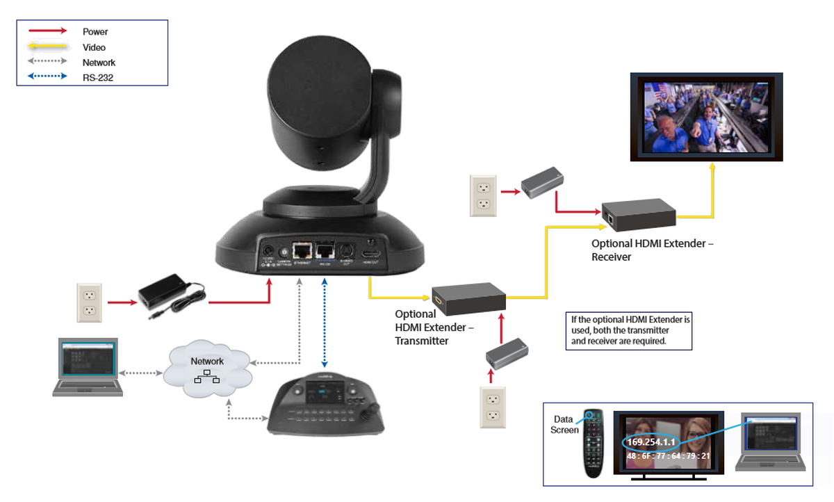 The PrimeSHOT camera is available as an individual camera, or it can be bundled with HDMI extenders. When used with a CAT5+ cable, HDMI extenders moves 1080p/60 HDMI up to 164 feet. The following items are included with the PrimeSHOT 20 camera: