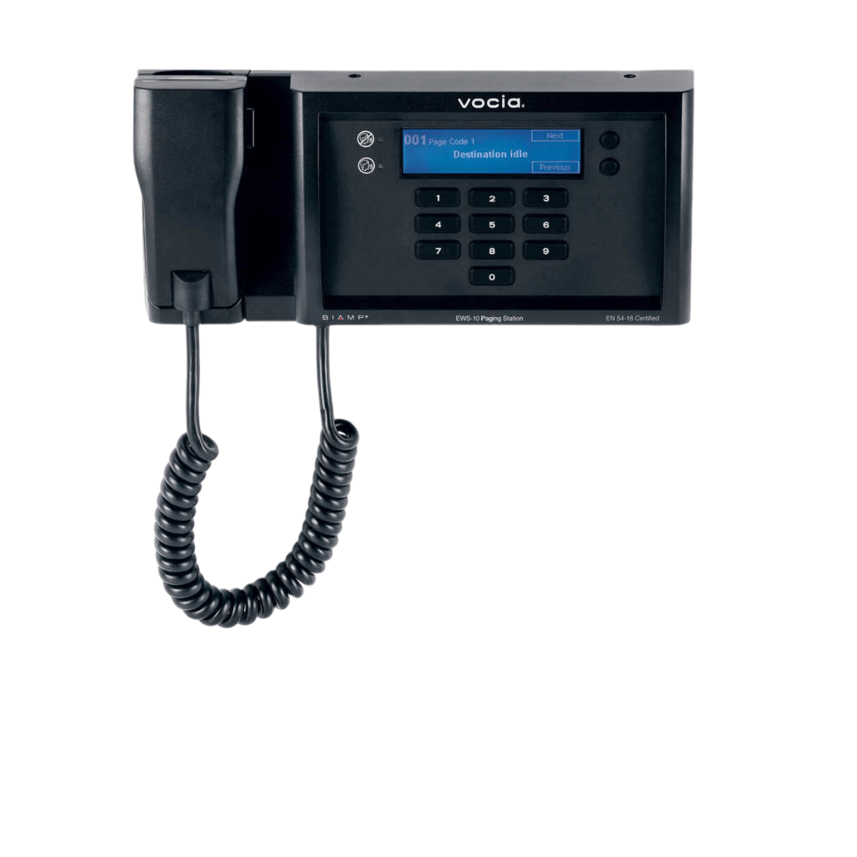 The EWS-10 is a wall-mounted networked paging station for use in Vocia systems. The EWS-10 features embedded DSP and on-board memory to support standard and advanced public address functionalities. The EWS-10 can store 999 user-configurable page codes. Additionally, all device-specific configuration information is stored locally, which means the EWS-10 does not rely on a centralized controller for processing and page routing. Thus, the processing, routing and storage functionality in a Vocia system is decentralized, which eliminates any centralized point of failure. As part of the Vocia system, the EWS-10 meets paging requirements for facilities of all sizes.