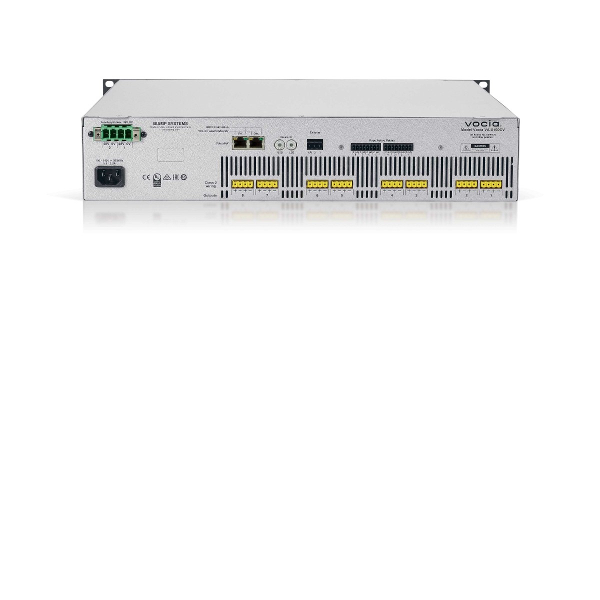 The VA-8150CV is a digital networked eight-channel constant voltage 70V/100V amplifier. It is CobraNet-enabled and capable of delivering continuous audio power at 150 Watts per channel. The VA-8150CV also has dual Ethernet ports for redundant CobraNet connectivity, comprehensive failover capabilities (device-to-device and channel-to-channel failover), and dual power inputs.