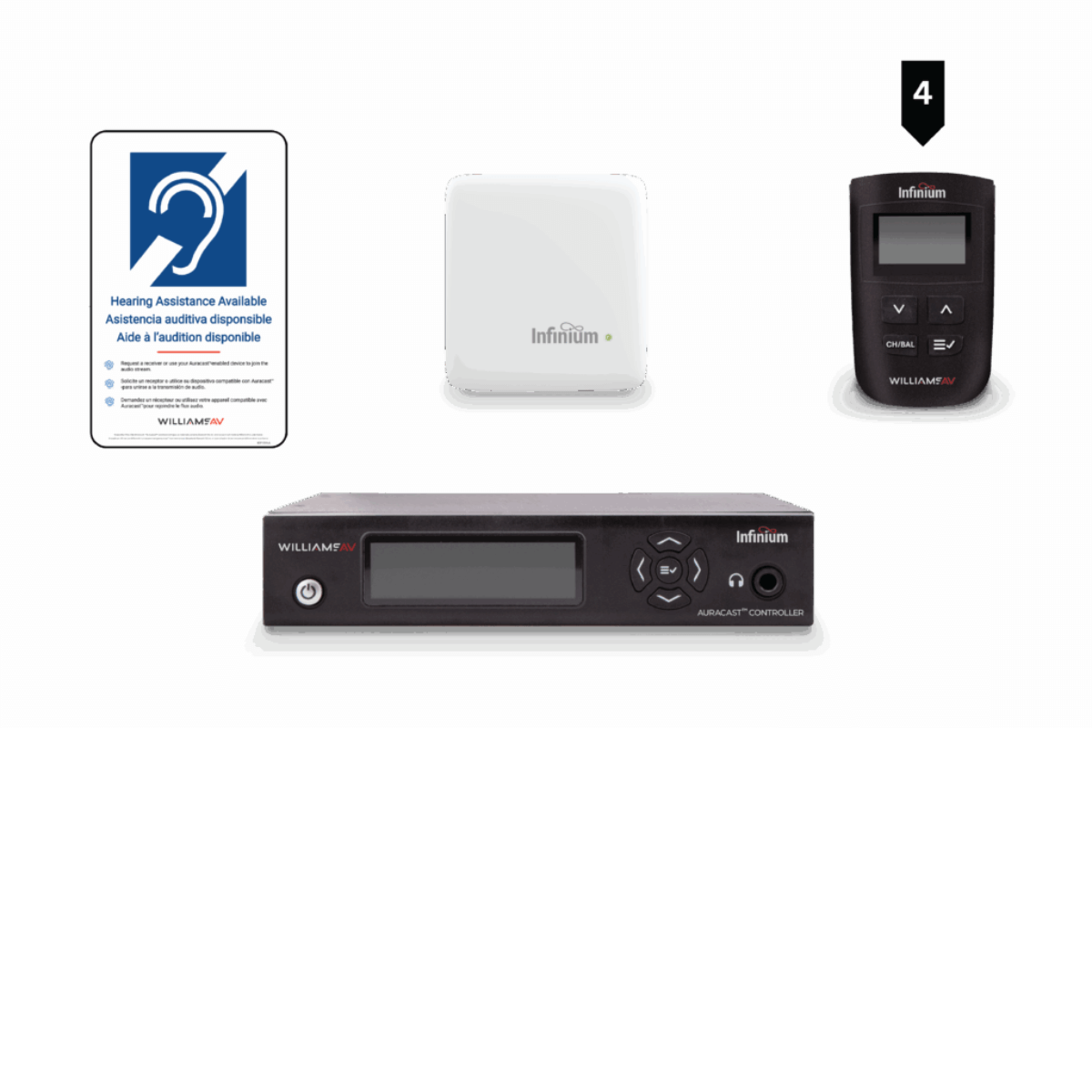 Engineered for commercial AV environments, Infinium is a modular Auracast broadcast audio system that delivers real-time, high-fidelity audio for assistive listening, and supports multilingual events and audio description. It supports unlimited Auracast enabled devicesincluding hearing aids, cochlear implants, headphones, and Infinium handheld receiversmaking it a powerful, ADA-compliant hearing solution for inclusive audio coverage across venues.