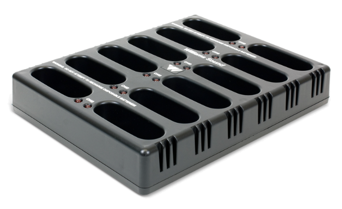 - The CHG 3512 shall be a 12-unit, drop-in battery charger and shall charge a maximum of 24 AA size NiMH batteries while they are installed into the Williams Sound PPA R37, PPA R35-8, R36, R863, RX22-4 style 3V receivers, or PPA T36, PPA T46, PFM T36, T863 style 3V transmitters.