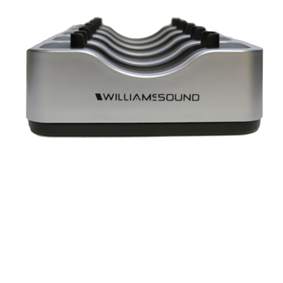 This multi-unit, drop-in style charger will conveniently charge and store up to 5 Williams AV IR RX20 under-the-chin style infrared receivers. Can daisy chain up to 3 chargers from one power supply. This 6-hour smart charger helps keep your products organized and batteries consistently charged*.