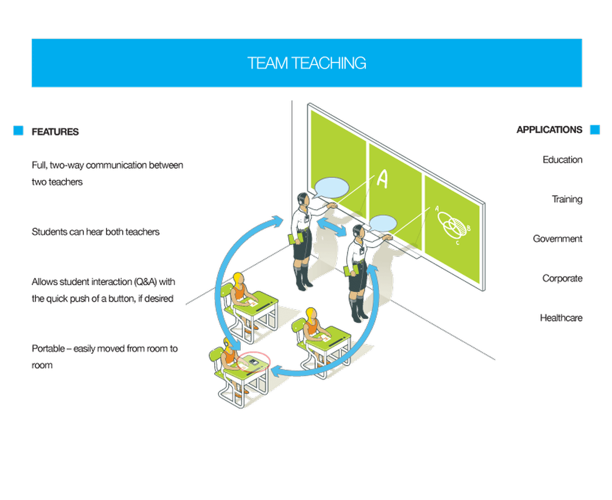 Add an optional DLT 300 and MIC 044 2P headset microphone to your DWS PCS 2 300 to create the ideal team-teach scenario. Two teachers can speak simultaneously and hear one another. The student can hear both teachers and has push-to-talk capability.