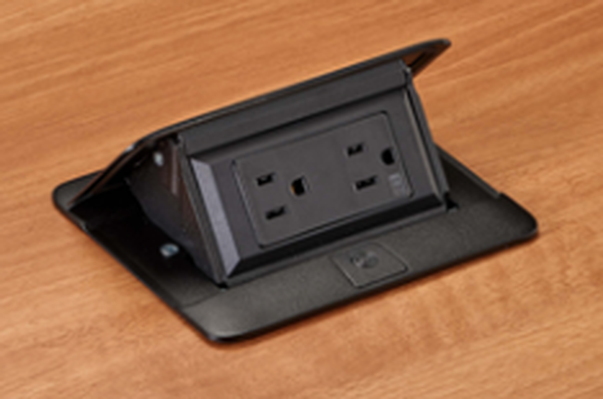 Wiremold's DQFP15BK is a black powder coat flip-up outlet. The outlet is designed to be mounted to be flush with the table top. This model features a 15A, tamper-receptacle with 2 outlets, and it is fitted with a 6-foot cord. This flip-up outlet is slim and low-profile, ensuring a seamless fit with your surface. Its sleek design makes it a great choice for conference and meeting rooms, as well as hotel rooms, kitchen, and office spaces.