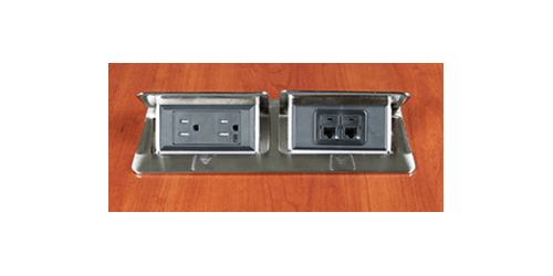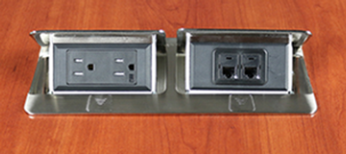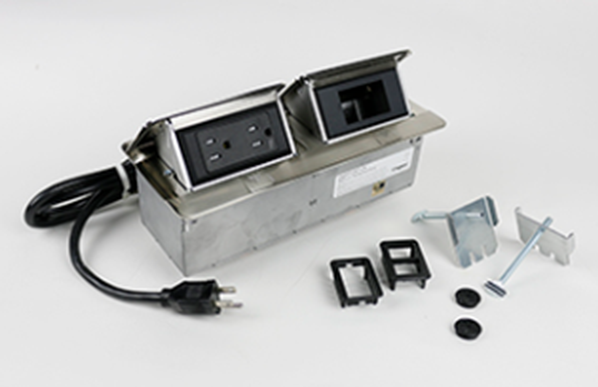 Wiremold's DQFP15ST-2A is a steel-colored flip-up outlet. The outlet is designed to be mounted to be flush with the table top. This model features a 15A, tamper-receptacle with 2 outlets and it is fitted with a 6-foot cord. The second flip-up opening features an adapter plug for a Wiremold CM series open system 2A module, an Ortronics Series II, or TracJack adapter for a variety of communication outlets. This flip-up outlet is slim and low-profile, ensuring a seamless fit with your surface. Its sleek design makes it a great choice for conference and meeting rooms, as well as hotel rooms, kitchen, and office spaces.