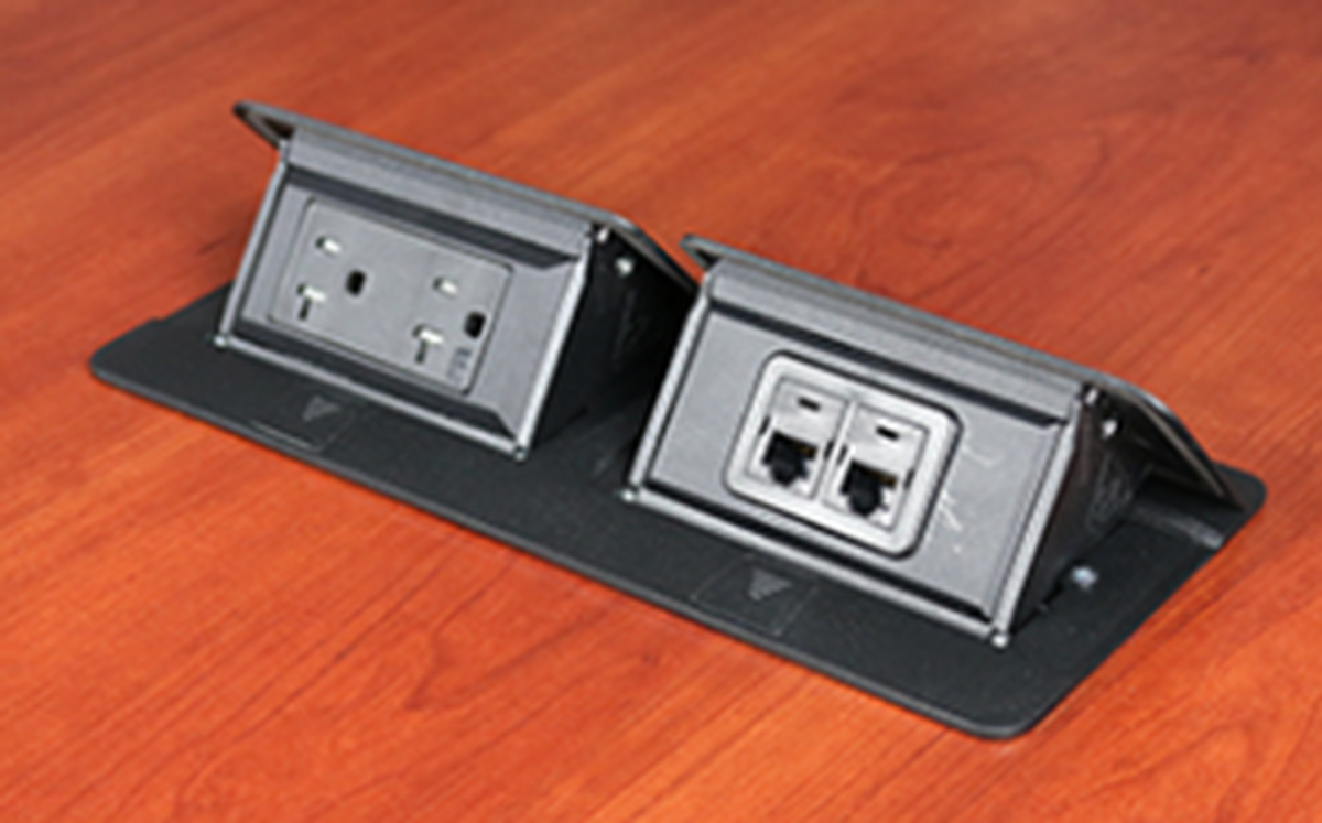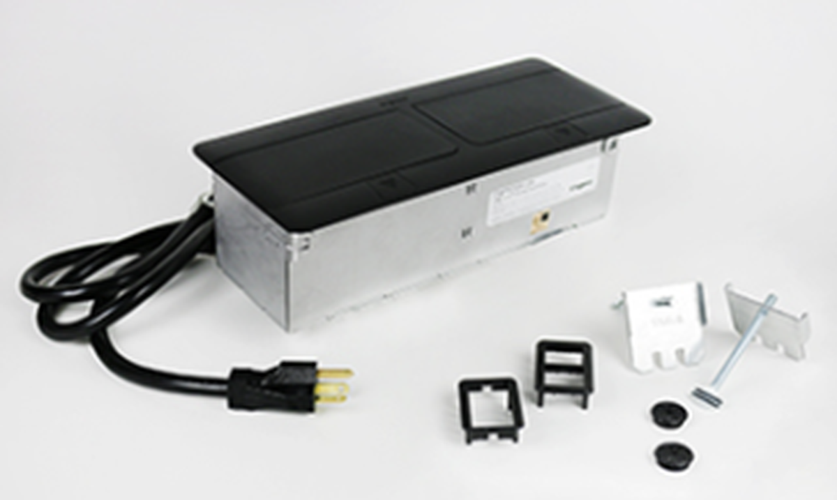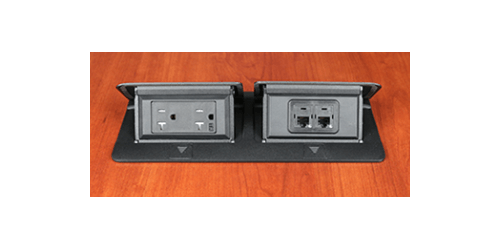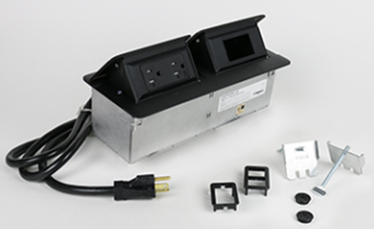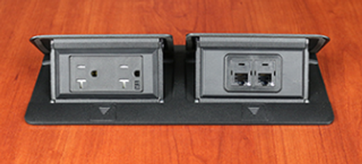 Wiremold's DQFP20BK-2A is a black powder coat flip-up outlet. The outlet is designed to be mounted to be flush with the table top. This model features a 20A, tamper-receptacle with 2 outlets and it is fitted with a 6-foot cord. The second flip-up opening features an adapter plug for a Wiremold CM series open system 2A module, an Ortronics Series II, or TracJack adapter for a variety of communication outlets. This flip-up outlet is slim and low-profile, ensuring a seamless fit with your surface. Its sleek design makes it a great choice for conference and meeting rooms, as well as hotel rooms, kitchen, and office spaces.