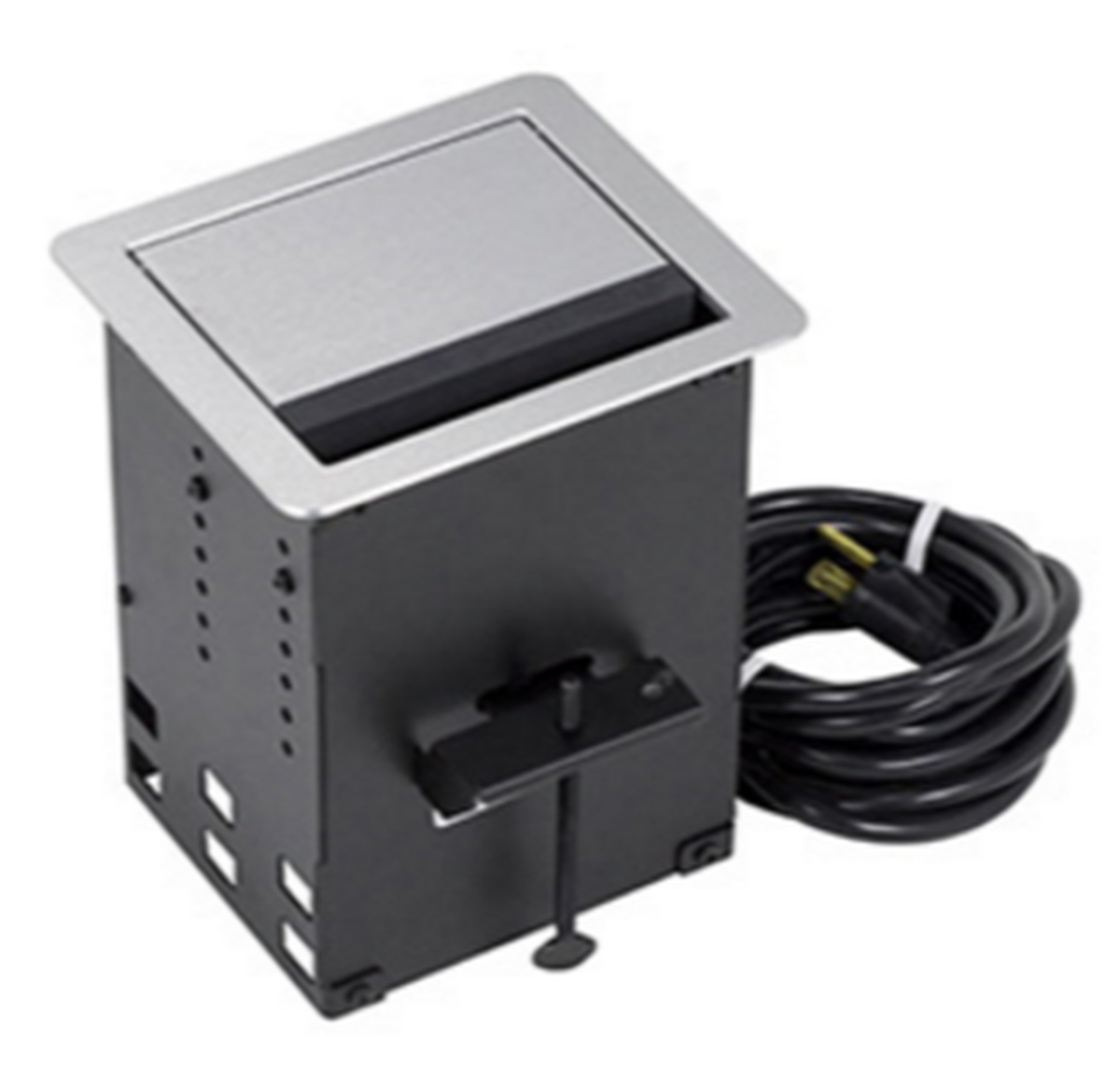 The lid retracts all the way down into the box, this is a great feature because it allows users from both sides of the table to access the connections without a lid in the way. The lid also has a small gap next to the soft touch handle that allows cables to be plugged in with the lid closed. Another great feature of the TB672AUAL is there is a third outlet on the under side of the box, this convenience outlet is ideal when you need to plug in another item such as a lamp or any other components under the table. The connections in the box can be installed anywhere from your choice of 1" to 4" from the top of the box, this is to allow for cables with varied head size or if you need cable storage.