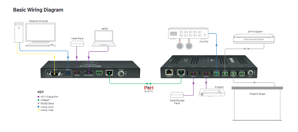 - HDBaseT: HDMI | HDCP 2.2 | EDID | 1-way PoC Receiver to transmitter