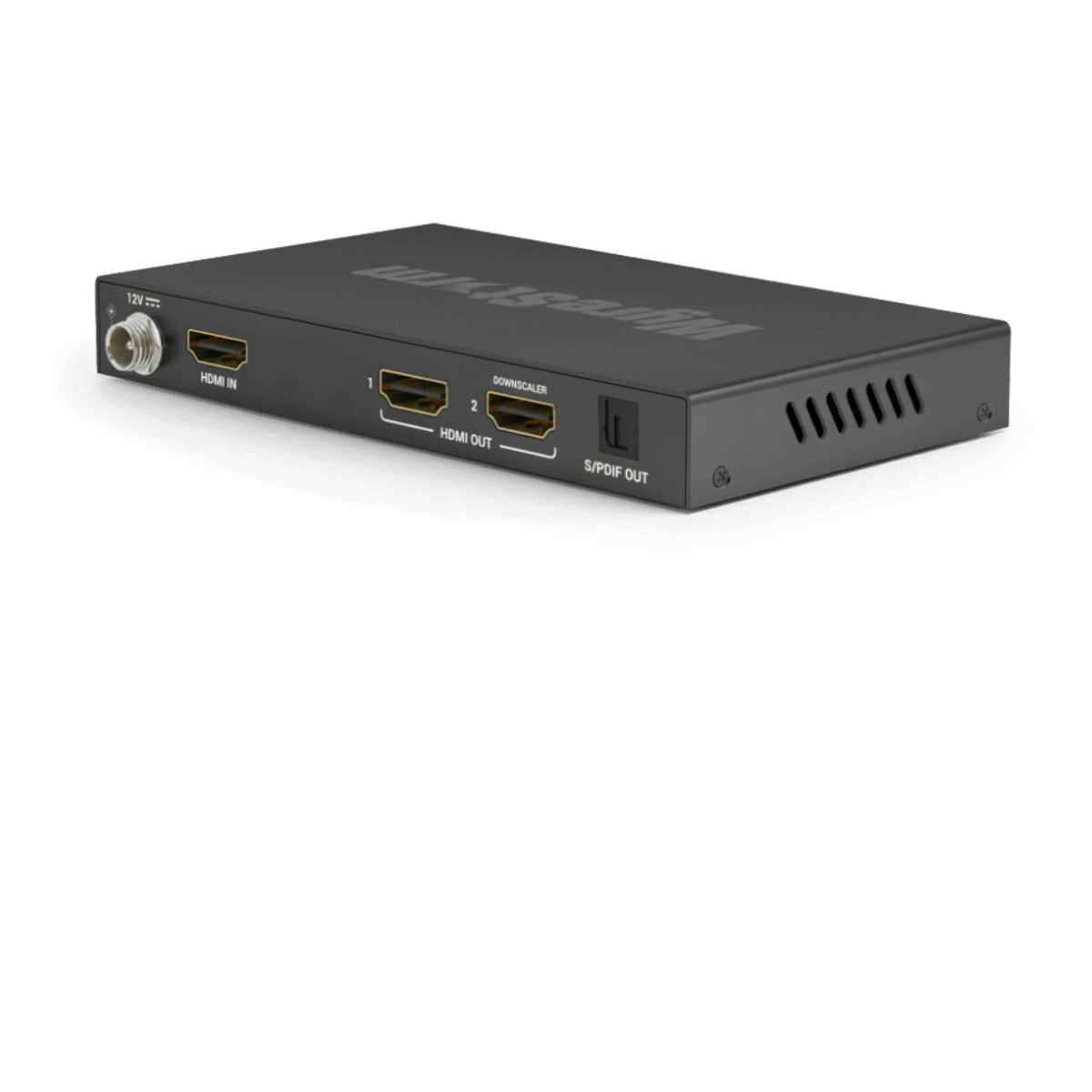 Our EXP-SP-0102-8K packs a punch as it is a powerful plug-and-play 8K HDMI splitter that has the ability to send uncompressed up to 8K@60Hz or 4K@120Hz up to two displays, but the most useful feature of this splitter is that the second output can scale content down from either 8K>4K or 4K>1080p! Furthermore, its compatible with DSC (Display Stream Compression) version 1.2a pass-through, an approved method of compression in accordance to the HDMI 2.1 specification, allowing up to a lossless 10K@120Hz signal to be transmitted.