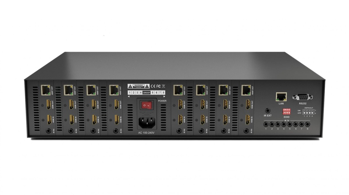 - Includes: 8 IR receivers, 8 IR emitters, 1 IR RX extension cable, power supply, rack mounting brackets, remote control, PC control software