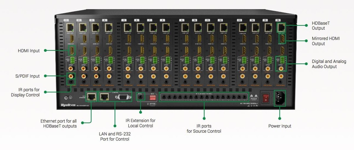 - Outputs: 16x HDMI 19-pin type A (Mirrors HDBaseT), 16x HDBaseT 8-pin RJ-45 female, 16x S/PDIF Out Coaxial Digital, 16x Audio Out 3pin Phoenix Connector