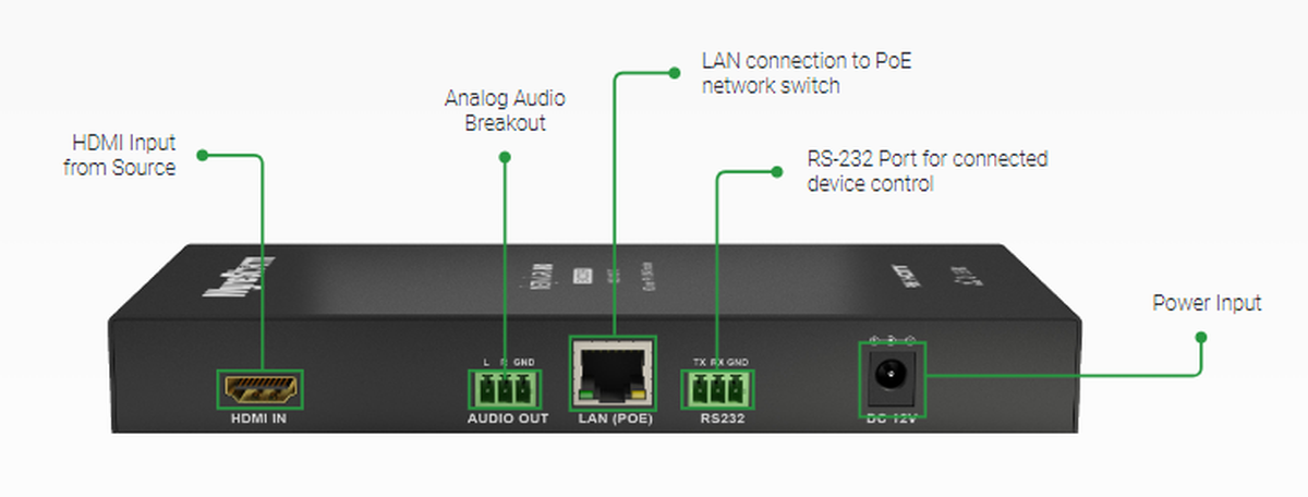 The NHD-100-TX H.264 encoder is intended for use with an NHD-100-RX H.264 decoder (sold separately) to provide a complete end-to-end video distribution system. It is also compatible with the NHD-000-CTL system controller, NHD-220-RX multiview decoder.