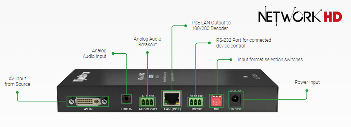 The NHD-200-TX H.264 encoder is compatible with any NetworkHD 100 or 200 series decoder to provide end-to-end streaming to individual displays or video wall decoding with the NHD-210-RX. It is also compatible with the NHD-000-CTL system controller.