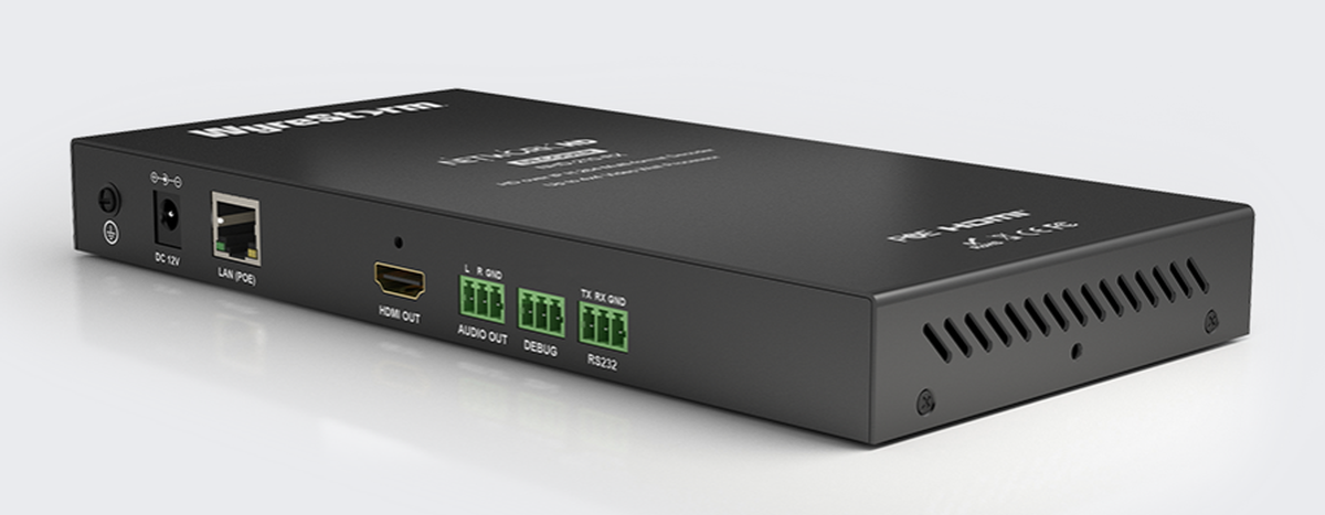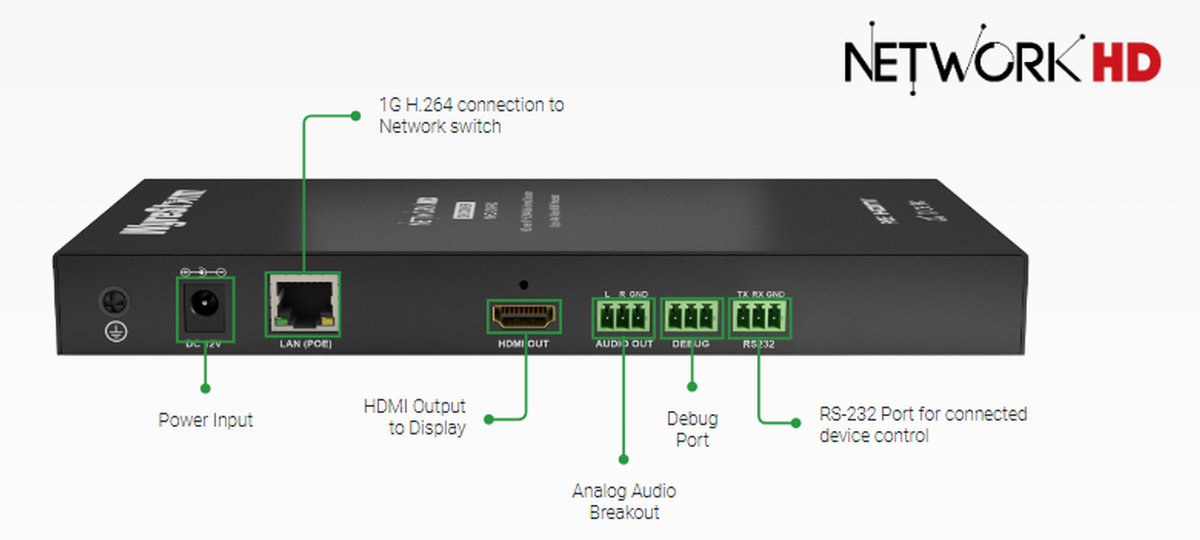 This decoder is compatible with the NHD-000-CTL system controller and all components are compatible with the NHD-000-RACK2 mounting system. This decoder supports PoE so that it can be remotely powered, which eliminates the need for a close proximity power outlet.