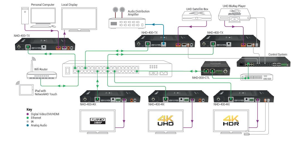 Using standard networking technologies, NetworkHD enables literally any point on the network to support the latest 4K video and HD audio, with PoE providing power to all components from the switch – thus eliminating ugly power supplies and potential points of failure from a system.