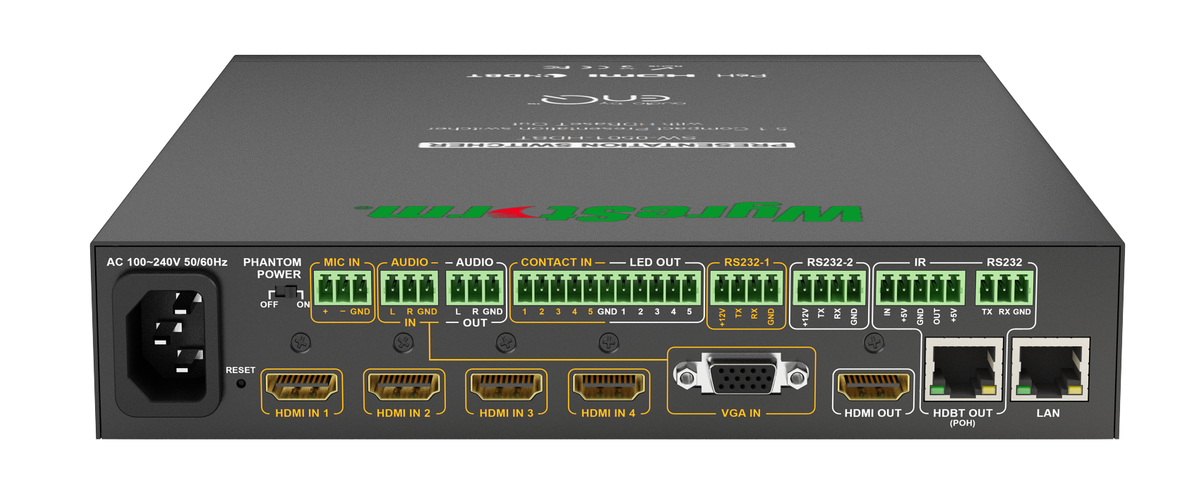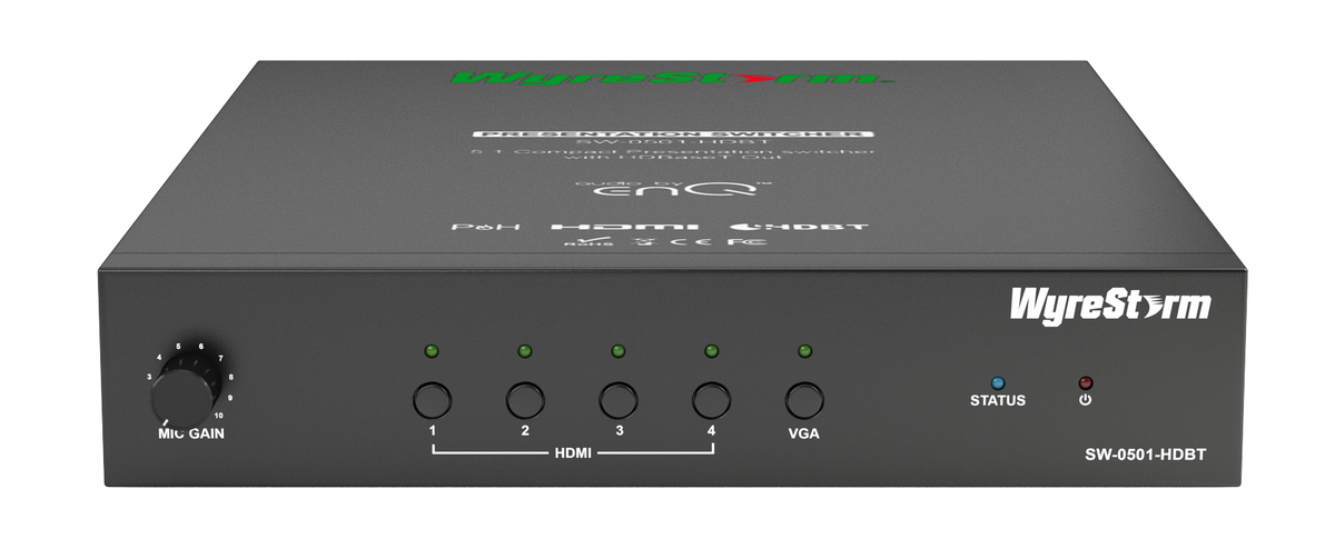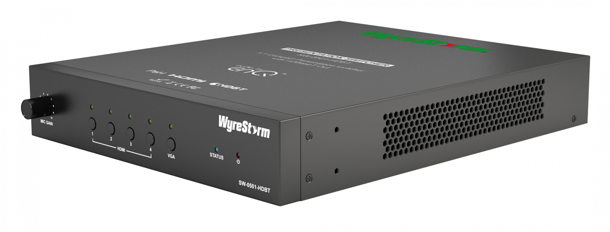 The WyreStorm SW-0501-HDBT is a multi-format presentation switcher and scaler that can also handle auto switching, auto switching always selects the last plugged in input and automatically switches on your display. The 5 inputs include; 4 HDMI, and 1 VGA source with embedded audio out. It outputs either 1 HDMI or 1 HDBaseT, the outputs can also be mirrored to 2 displays. The HDBaseT transmitting output can send your 1080P video up to 328', it also sends PoH so your receiver does not require power.