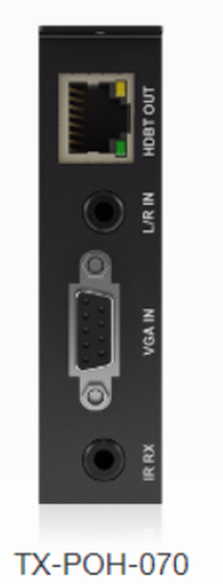 The WyreStorm TX-POH-070 is a card for the WyreStorm MX-0808-PP-POH-CUSTOM or WyreStorm MX-1616-PP-POH-CUSTOM modular series of matrix switchers. The card offers HDBT out, VGA and stereo audio in, and IR in.